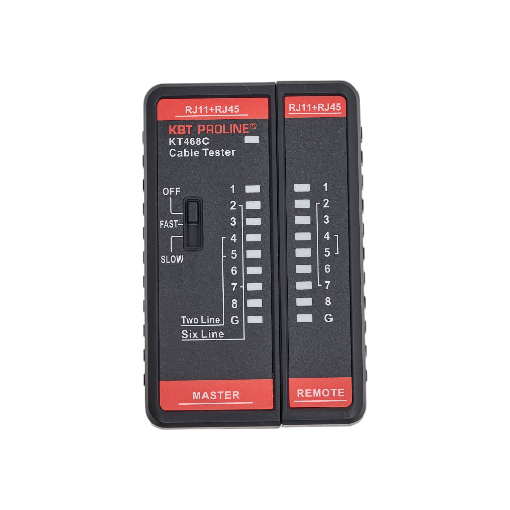 Тестер для проверки витой пары и телефонного кабеля с возможностью обнаружения обрыва и короткого замыкания, правильности обжима и целостности экрана витой пары, а также для устранения неполадок в перекрестных сетях. Тип кабеля: экранированные и неэкранированные витые пары; телефонные кабели RJ45, RJ11; коаксиальные кабели (модель КТ 468В ). Дополнительные характеристики: Разъемы: RJ45 и RJ11 (объединенный порт); Максимальная длина исследуемого кабеля: 305 м; Тип индикатора: светодиодный; Две скорости тестирования: стандартная и ускоренная.