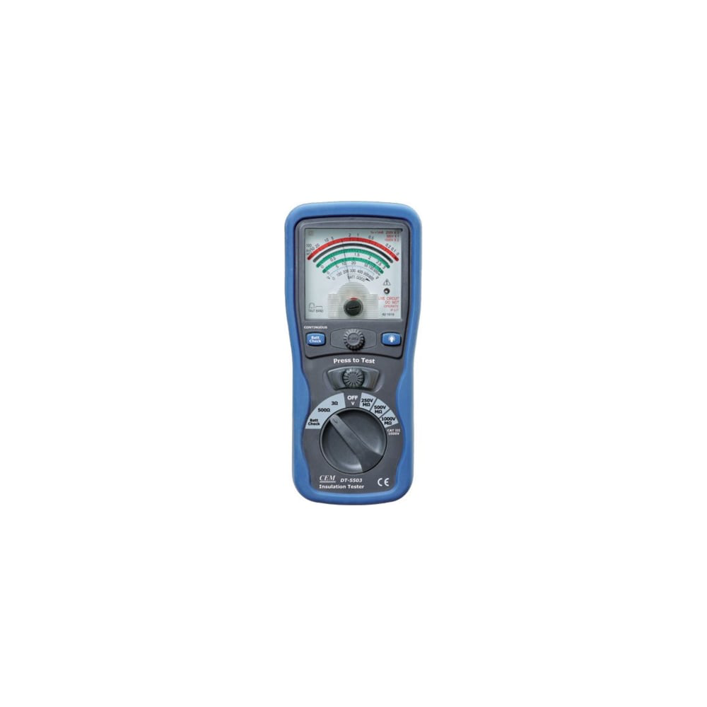 Аналоговый тестер изоляции и электропроводимости СЕМ DT-5503 480489 применяется для измерения электропроводности. Инструмент не вызывает затруднений у пользователя благодаря простой конструкции. Модель работает в 3 диапазонах проверки изоляции: при напряжении 250 В, 500 В и 1000 В. Фактическое переменное напряжение отображается на экране тестера.