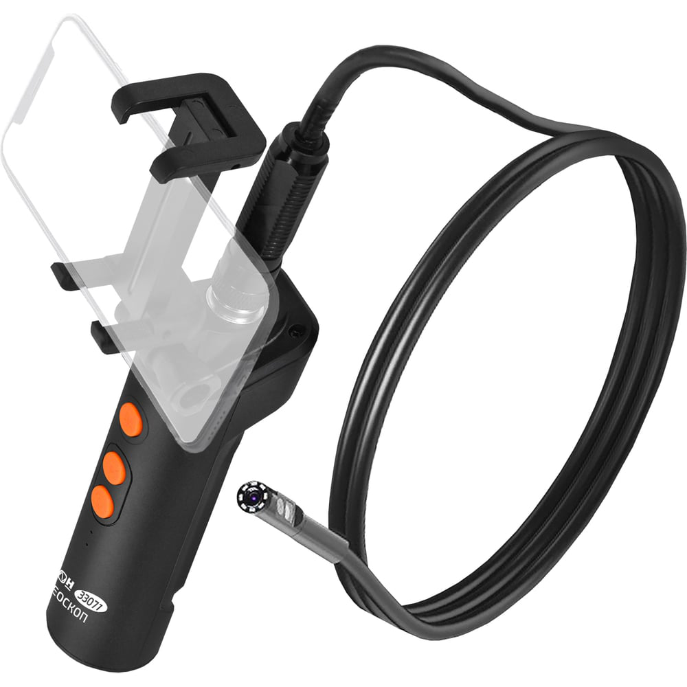 Эндоскоп МЕГЕОН 33071 к0000035634 представляет собой рукоятку с держателем для мобильного устройства связи и отсоединяемым зондом. При помощи Wi–Fi можно передать изображение мобильному устройству на платформе Android и IOS. Необходимое приложение доступно для скачивания без ограничения в Play Market и APP Store. Имеется возможность работать с большим количеством мобильных устройств. Размер изображения зависит только от диагонали экрана личного смартфона или планшета. Конструкция захвата позволяет свободно удерживать гаджет шириной до 73 мм, но это не мешает держать более габаритный аппарат в руках, так как передачу данный обеспечивает дистанционная связь. Видеонаблюдение осуществляется с двух пыле- влагозащищенных камер – фронтальной и боковой. Яркая светодиодная подсветка высокой интенсивности гарантирует прекрасную видимость в полном отсутствии освещения. Зонд жесткого исполнения стыкуется к рукоятке при помощи разъемного соединения.