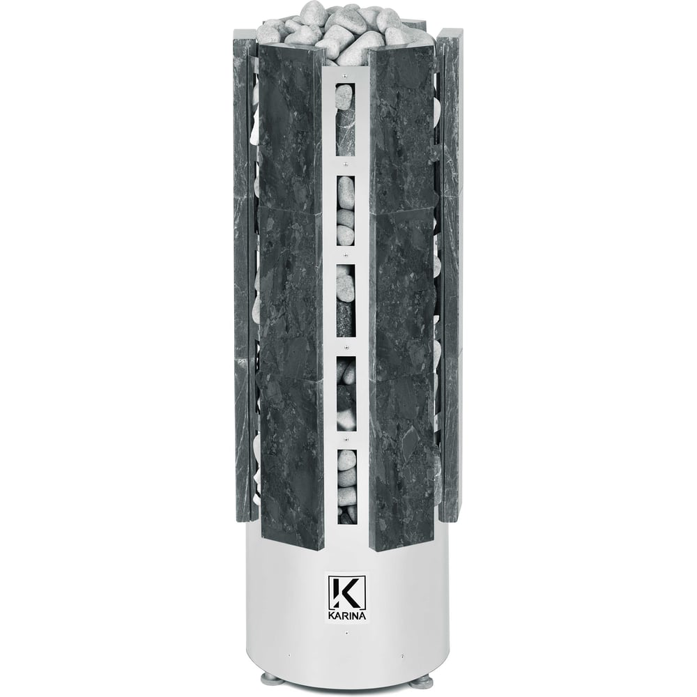 Электрокаменка Karina Forta 21 Онего Грин выполнена в напольном варианте и обладает цилиндрической формой дополненной плитами из натурального камня Онего Грина. Напряжение питания - 380В. Данная модель имеет 6 тэнов, расположенных в виде треугольника. В центре внизу расположен бак для воды емкостью 5л, который является парогенератором. Выше парогенератора имеется емкость под мелкие камни или нержавеющие шары объемом 4.7л, вмещающая 10 кг мелкого камня это - закрытая каменка с воронкой для подачи воды и получения мелкодисперсного пара. Электрокаменка Karina Forta 21 Онего Грин подойдет как финской сауны, так и русской бани.Если в парогенератор не заливать воду, то каменка разогреет парную до высокой температуры (100 -120°C) с относительной влажностью воздуха 10-12% - режим сухой бани (финская сауна). Если залить воду в парогенератор, при разогреве парной вода будет испаряться и увлажнять воздух до режима русской бани (60-70°C и 40-50% влажности). В обоих случаях использование закрытой каменки дополнительно прибавит мелкодисперного необжигающего пара.Все корпусные элементы печи выполнены из нержавеющей стали. Нагревательный элемент - ТЭН диаметром 10мм. Наружный кожух дополнительно облицован плитами из Онего Грина толщиной 40мм, что придает ей еще большую теплоемкость и меньшее излучение от металлических элементов, которые выжигают воздух в парной. Общий вес камней – 205кг (120кг загрузка камней в печь и 85кг - вес облицовки), что сопоставимо с закладкой камней в дровяную печь.