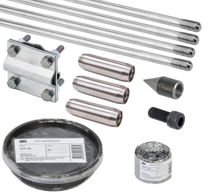 Комплект заземления товарного знака IEK используется для организации заземляющего устройства жилых объектов, объектов энергетического и промышленного комплексов, объектов связи. Данный комплект монтируется на глубину 6 метров путём последовательного соединения и заглубления стержней с помощью перфоратора или кувалды.Стержни комплекта имеют резьбу на обоих концах и соединяются между собой посредством муфт. Для обеспечения надёжного электрического контакта места соединения смазывают токопроводящей пастой. При монтаже в муфту, с противоположной стороны от стержня, вкручивается удароприёмная головка, которая принимает на себя энергию ударного молотка, не допуская деформации стержней заземления и соединительной муфты, в которую плотно вкручивается. Верхний заземлитель подключают с помощью зажима к горизонтальному проводнику системы молниезащиты. Данное соединение сверху закрывают изоляционной лентой для защиты от попадания влаги и образования коррозии.