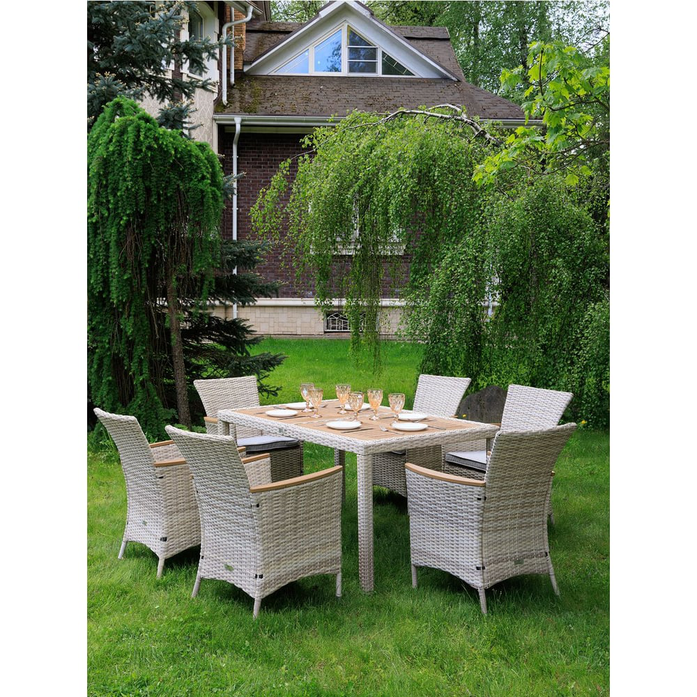 Габариты: Кресла - 60х60х88 см Обеденный стол - 150х90х75 см Материалы: Материал комплекта - искусственный ротанг (ручного плетения) Материал каркаса – сталь, окрашенная порошковым методом Материал столешницы - поливуд (искусственное дерево) Материал чехла на подушки - олефин (водоотталкивающая ткань) Материал наполнителя подушек для сидения - поролон Дополнительная информация: Количество посадочных мест – 6 человек Максимальная нагрузка на посадочное место - 150 кг Чехлы съемные - да Температурный режим - от -50C до +50C Сочетается с комплектами бренда ROYAL FAMILY из искусственного ротанга в бежевом цвете Накладки на ножки - да (пластиковые) Категория ротанга - первичная Держатели и крепления подушек зависят от поставки и не являются неотъемлемой частью комплекта Гарантийный срок - 1 год, эксплуатационный срок - 10 лет